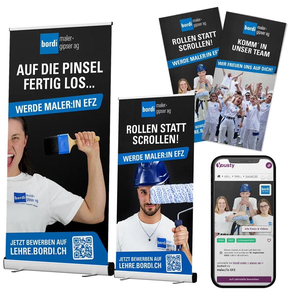 Für den Lehrstellen-Messeauftritt wurden Roll-Ups und Flyer im bestehenden Markenstil umgesetzt.